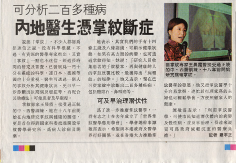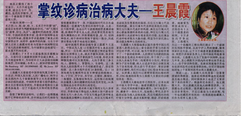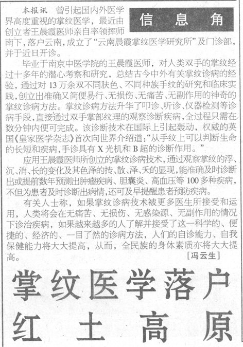 2005年10月14日《云南政协报》第七版,《掌纹诊病治病大夫——王晨霞》